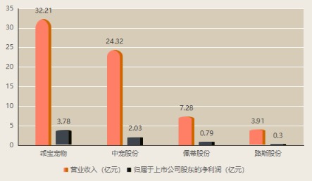四家宠物食品公司今年上半年业绩情况。新京报贝壳财经记者阎侠制图 乖宝宠物是4家公司里最后一个登陆A股的宠物食品公司,如今却稳坐业绩冠军宝座,得益于其快速发展的自有品牌业务。成立之初,乖宝宠物从事境外宠物食品代加工,经过多年积累,产品销往欧美、日韩等多个国家和地区。 2013年,乖宝宠物创建自有品牌“麦富迪”,相继开发出双拼粮系列、益生菌系列主粮、全价湿粮、全价冻干主粮等产品。此后,公司又打造出自有高端鲜肉猫粮品牌——弗列加特。2024年,乖宝宠物自有品牌的营收约35.45亿元,同比增长29.14%,占公司总营收的67.59%。 今年上半年,中宠股份同样实现营收净利同比双增,其中,归母净利润2.03亿元,同比增长42.56%。贝壳财经记者注意到,自2017年8月上市以来,中宠股份的产品结构持续调整,作为营收主力的宠物零食,营收占比显著下滑,而宠物主粮在营收规模、营收占比、营收增速、毛利率等指标上全面增长。 分地区来看,中宠股份的过半营收来自境外。今年上半年,中宠股份在境内、境外获得的营业收入分别约为8.57亿元、15.75亿元,营收占比分别为35.25%、64.75%。 作为4家公司里最早登陆A股的佩蒂股份,今年半年报稍显失意,营业收入和归母净利润分别同比下降13.94%和19.23%。 在8月26日的业绩说明会上,公司管理层表示:“2025年上半年,营业收入虽然受到关税以及国内业务调整的影响,与去年同期相比略有下降,但毛利率明显提升,经营质量相对更好。毛利率提升主要得益于东南亚工厂的生产成本、出厂价格优势以及产能释放带来的规模效应。” 值得一提的是,今年上半年,佩蒂股份经营活动产生的现金流量净额同比大幅下滑,由正转负。对此,公司方面解释:“主要是当前和客户的合作模式导致的,到年底的时候现金流基本都会回正,且金额比较大。” 贝壳财经记者注意到,海外市场是佩蒂股份主要的收入和利润来源。2024年,公司国外销售收入占总营收的82.63%。公司承认存在海外核心客户收入占比较大的风险。 路斯股份的产品同样以出口为主。今年上半年,路斯股份的内销收入占比36.08%,同比减少86.94万元,同比下降0.62%。内销收入下降主要因为肉粉产品收入下降明显,同比减少522.38万元,但宠物食品国内收入同比增加463.12万元。相比之下,路斯股份的外销收入占比63.92%,同比增加3966.41万元,同比增长19.25%,主要原因系肉干、罐头及主粮产品成为境外收入增加的三大品类。其中,肉干产品同比增加900.48万元,同比增长4.97%;罐头产品同比增加1384.99万元,同比增长102.20%;主粮产品同比增加766.97万元,同比增长146.22%。 苏商银行特约研究员武泽伟告诉贝壳财经记者,四家A股宠物食品公司2025年中报呈现“分化增长”态势,“共性方面包括以宠物食品为主业,除佩蒂股份外均实现营收增长,反映行业整体扩容。差异方面,乖宝宠物领跑,中宠股份通过产品结构优化实现归母净利润高速增长,佩蒂股份和路斯股份则面临成本管控与市场竞争挑战。” 宠物主粮毛利率高,“好生意”暗藏玄机? 作为饲养宠物的刚性需求,宠物食品行业规模正经历快速增长。 中商产业研究院发布的《2025年至2030年中国宠物经济市场前景预测及未来发展趋势报告》显示,当前,宠物食品已成为我国宠物经济中最大的细分市场,2024年市场规模达1668亿元,同比增长7.54%,预计2025年将达到1755亿元。 宠物食品主要分为宠物主粮与宠物零食。宠物主粮作为日常营养核心,形成干粮、湿粮两大品类,其市场地位稳定且需求刚性;宠物零食则在消费升级趋势下快速崛起,通过功能化创新和场景细分,逐步突破传统副食定位,形成独立增长曲线。 今年上半年,A股四家宠物食品公司靠“毛孩子”的口粮在全球揽金逾67亿元。然而,亮眼的营收数字背后,各家的毛利率却经历冷暖。这门看似风光的“毛孩子经济”,到底算不算好生意?