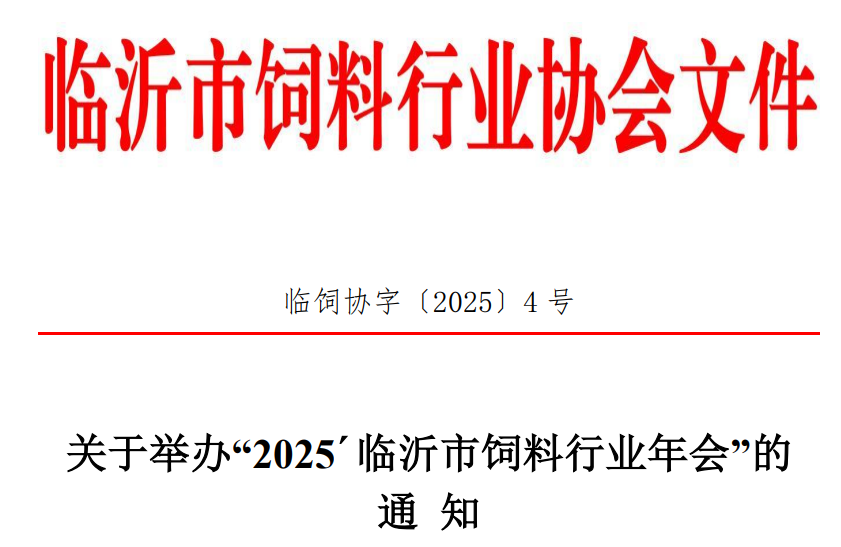 各县区饲料协会、会员单位及有关单位: 为促进我市饲料行业交流与合作,分析当前形势,展望未来趋势,推动行业科技创新与高质量发展;经研究并报经主管部门同意,拟定于2025年12月25日-27日召开“2025’临沂市饲料行业年会”,请各会员企业提前安排好工作积极参加。年会还邀请了行业领导和国内知名专家莅临会议,同时诚邀其他企事业单位参与和支持。现将有关事宜通知如下: